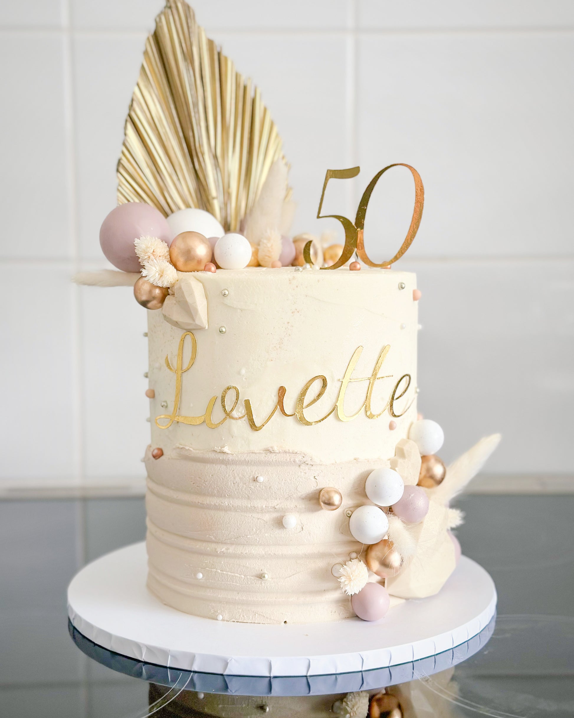 This 'au naturale' theme cake with natural tones & dried palm topper, edible cake heart, buttercream finish. Perfect for any celebration or gift.